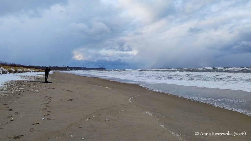 Jedną z największych zalet jeżdżenia nad polskie morze w styczniu przy brzydkiej pogodzie jest mniejsza szansa korków na DW216 i brak problemów ze znalezieniem miejsca do parkowania w centrum nadmorskiej miejscowości. Udało nam się bez problemu zaparkować auto przy ul. Brzozowej, nieopodal portu. Już kilkaset metrów od brzegu słychać było fale uderzające o brzeg, których dźwięk przypominał nam trochę jednostajny szum związany z ruchem ulicznym. Po wyjściu na plażę wyjściem nr 3 od strony ul. Hryniewieckiego, naszym oczom ukazało się wzburzone morze wraz z nielicznymi spacerowiczami i jednym szalonym kitesurferem-morsem, który musiał mieć tego dnia na sobie jakąś kosmiczną piankę surfingową zaprojektowaną chyba przez NASA, bo nie wiem jakim cudem jego strój zdawał egzamin przy takich minusowych temperaturach…