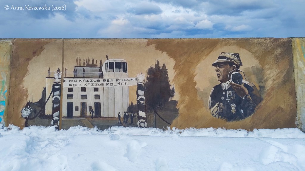 Większość spacerowiczów kończyła swoją podróż w połowie falochronu, żeby nie przemoczyć całego stroju. Zrobiliśmy to samo, co większość, ponieważ Daniel skutecznie ostudził mój zapał dojścia aż do samej latarni nawigacyjnej, a ja przypomniałam sobie ponownie o przemoczonych butach. Z tego powodu wracając w stronę portu skupiłam swoją uwagę na malowidłach przedstawionych na falochronie. Mural powstał na falochronie północnym w 2020 roku na pamiątkę 100. rocznicy zaślubin Polski z Morzem. Rozciąga się na długości około 500 metrów i przedstawia na 70. obrazach historię Władysławowa od jego początków jako osady rybackiej aż po czasy współczesne. Moim zdaniem, prezentuje się zacnie, nawet przy sztormowej pogodzie.
