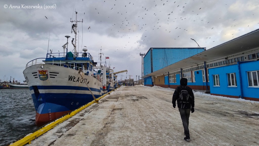 Gdy zakończyliśmy „inwentaryzację” falochronu północnego, postanowiliśmy wydłużyć nieco spacer. Zaproponowałam obejście ogólnodostępnej części portu, żeby zapamiętać jej obecny kształt zanim zacznie się planowana przebudowa. Niestety zdjęcia nie potrafią oddać siły i temperatury wiatru, który prawdopodobnie skutecznie niwelował tego dnia fetor ryb unoszący się zazwyczaj nad przetwórnią przy Nabrzeżu Przeładunkowym.