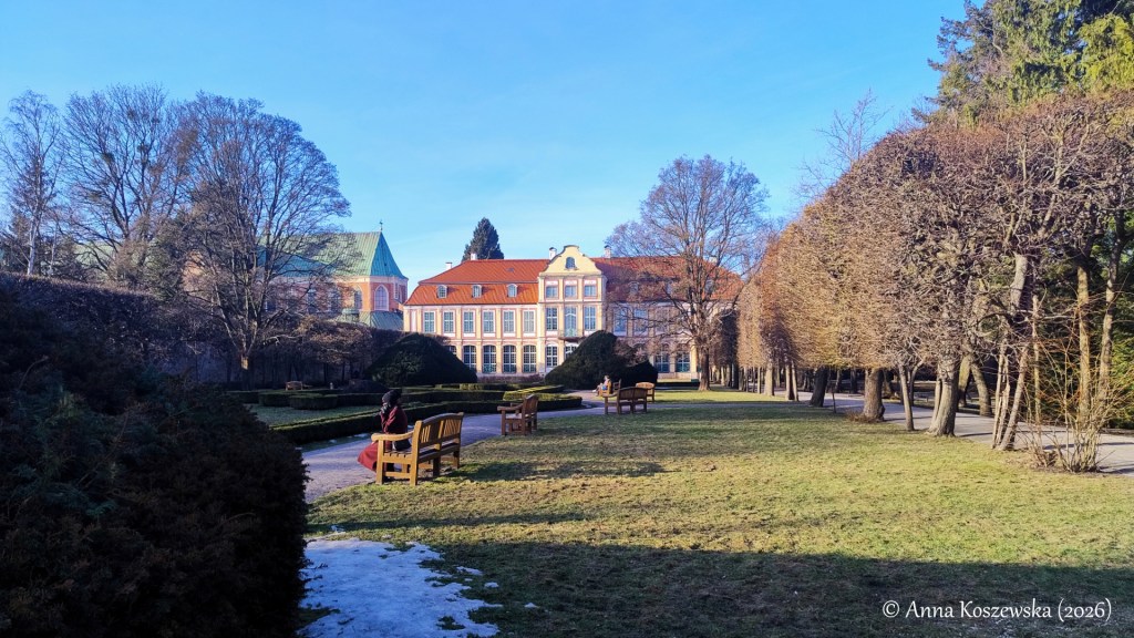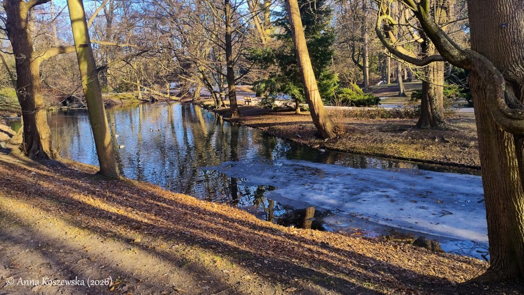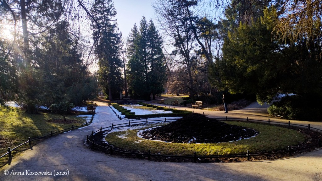 Zobaczyłam za to elementy instalacji świetlnych z okresu świątecznego oraz ostatnie pozostałości śniegu i lodu pojawiające się gdzieniegdzie w zaułkach z mniejszym dostępem światła słonecznego. Klimat wydawał mi się dziś dość senny i melancholijny, mimo słonecznej pogody. Ludzi również krążyło dziś po Parku Oliwskim dużo mniej niż zazwyczaj, co jest moim zdaniem absolutnie zrozumiałe, ale ja nie jestem, jak już pisałam, obiektywna w tej kwestii.